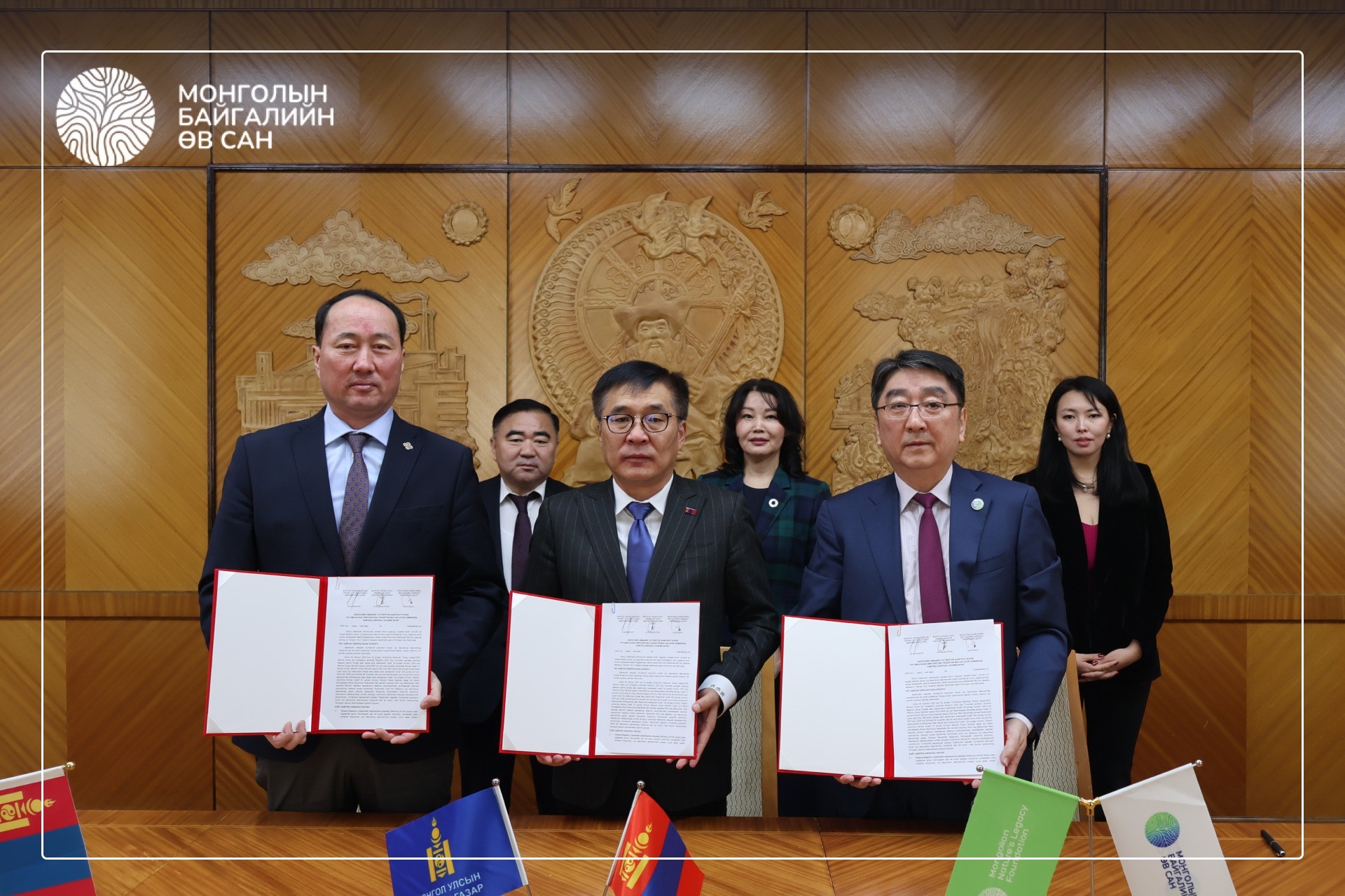 Байгаль орчин, уур амьсгалын өөрчлөлтийн сайд Б.Батбаатар, Хүнс, хөдөө аж ахуй, хөнгөн үйлдвэрийн сайд М.Бадамсүрэн болон Монголын Байгалийн Өв Сан (МБӨС)-гийн Удирдах зөвлөлийн дарга М.Болдоо нар хамтын ажиллагааны санамж бичигт гарын үсэг зурлаа.