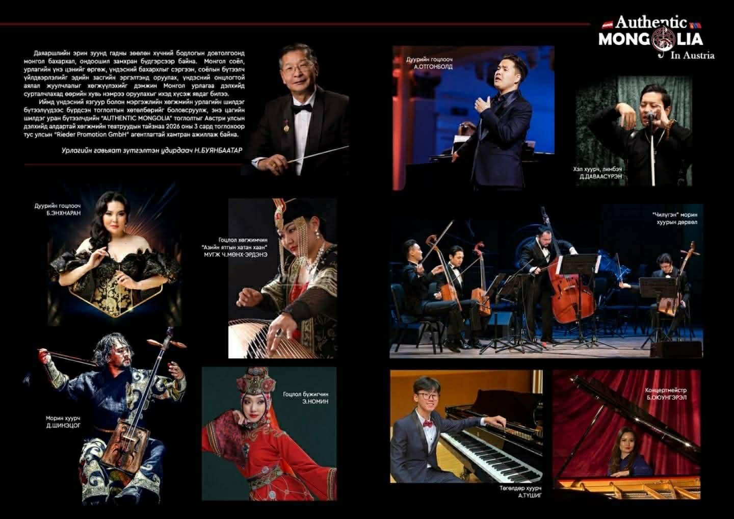 Монголын үндэсний болон сонгодог урлагийн шилдэг уран бүтээлчдийн баг Австри улсын Вена хотыг зорино. Тэд Монгол Улсаа сурталчлах хүрээнд Австри улсын Вена, Граз, Линц хотуудад тоглолт хийнэ.
